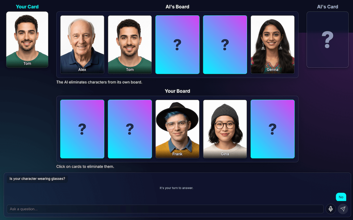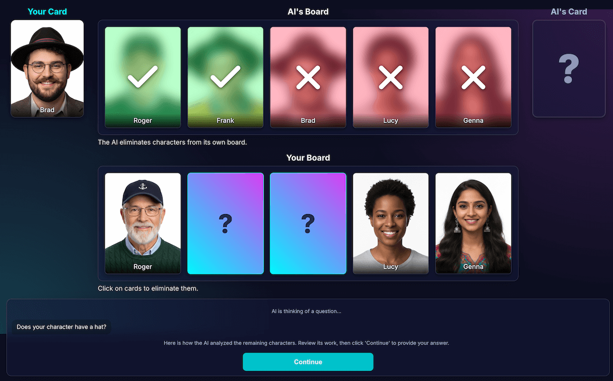 不過,即使有這種區隔,我還是發現模型的感知能力可能存在缺陷。系統可能會誤判角色是否戴眼鏡,導致淘汰結果錯誤,令人沮喪。為解決這個問題,我嘗試了兩步驟程序:AI 會提出問題,收到玩家的答案後,系統會以該答案做為脈絡,再次進行分析。理論上,第二次檢查可能會發現第一次檢查的錯誤。
