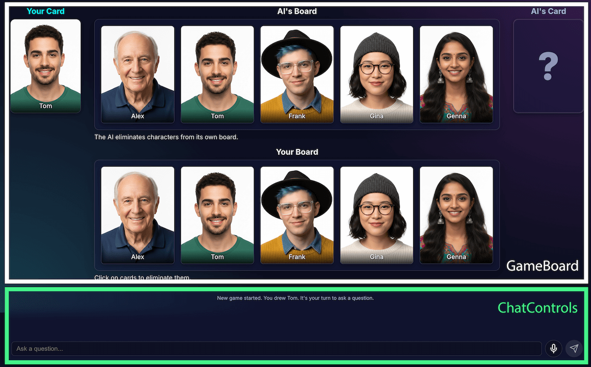 My application, AI Guess Who?, is built with React and uses the Prompt API and a browser built-in model to create a surprisingly capable opponent. In this process, I discovered it's not so simple to get "pixel-perfect" results. But, this application demonstrates how AI can be used to build thoughtful game logic, and the importance of prompt engineering to refine this logic and get the outcomes you expect.