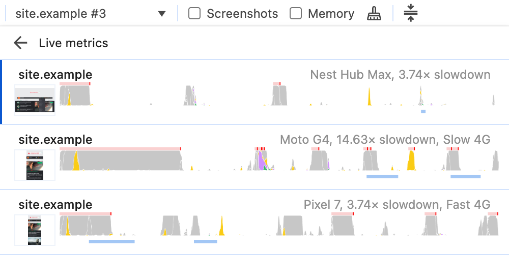 Una discrepancia común en el trabajo de rendimiento web es que, como desarrolladores, a menudo compilamos sitios en dispositivos de escritorio rápidos, mientras que muchos de nuestros usuarios usan dispositivos móviles más modestos. Hacer un seguimiento de un problema de rendimiento puede ser complicado cuando solo ocurre en un dispositivo con una CPU mucho más lenta.