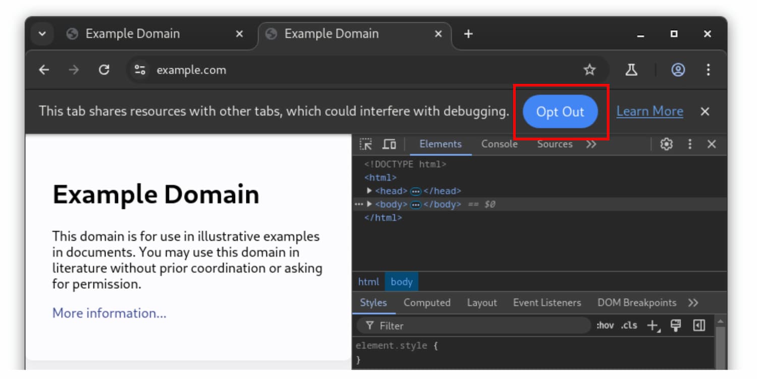 หากเห็นข้อความ "แท็บนี้ใช้ทรัพยากรร่วมกับแท็บอื่นๆ..." ในแถบข้อมูลขณะที่เครื่องมือสำหรับนักพัฒนาเว็บเปิดอยู่ แสดงว่าคุณเป็นส่วนหนึ่งของกลุ่มเล็กๆ ที่เปิดใช้การทดสอบการแชร์กระบวนการ โพสต์นี้อธิบายการทดสอบ