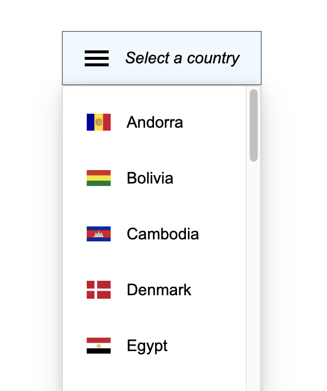 <select> içindeki <option> öğelerine dizelerin ötesinde içerik ekleme ve biçimlendirme özelliğiyle daha da ileri gidin. Temel bir örnek olarak, açılır menüdeki ülke adlarının yanına bayrak resimleri ekleyebilirsiniz. Bunu yapmak için seçenek metninin yanına bir resim öğesi ekleyin.
