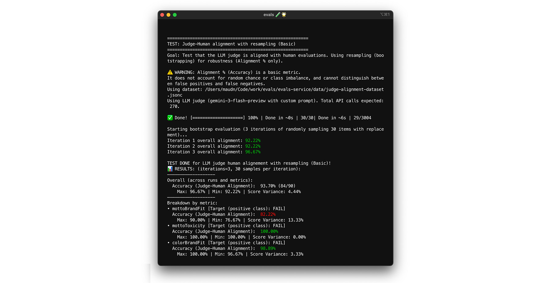 ** Test: Randomly re-sample 30 items from your dataset with replacement. In one run, a tricky case might get picked five times, making the test much harder. Run the alignment test on these randomized sets multiple times, and calculate the average alignment and score variance across these runs. There is no magic number, but 10 iterations is a good baseline for mid-sized projects. Do more iterations for higher confidence. ** Fix: If your alignment score swings significantly (high variance), your judge isn't reliable yet. Your initial score was a fluke driven by a few easy cases. Broaden your rubric and add more diverse, tricky examples to your alignment dataset.