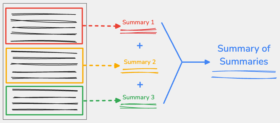 Wenn ein Dokument beispielsweise in drei Teile unterteilt ist, wird jeder Teil zusammengefasst. Diese drei Zusammenfassungen werden zusammengefasst und noch einmal zusammengefasst, um das Endergebnis zu erhalten.