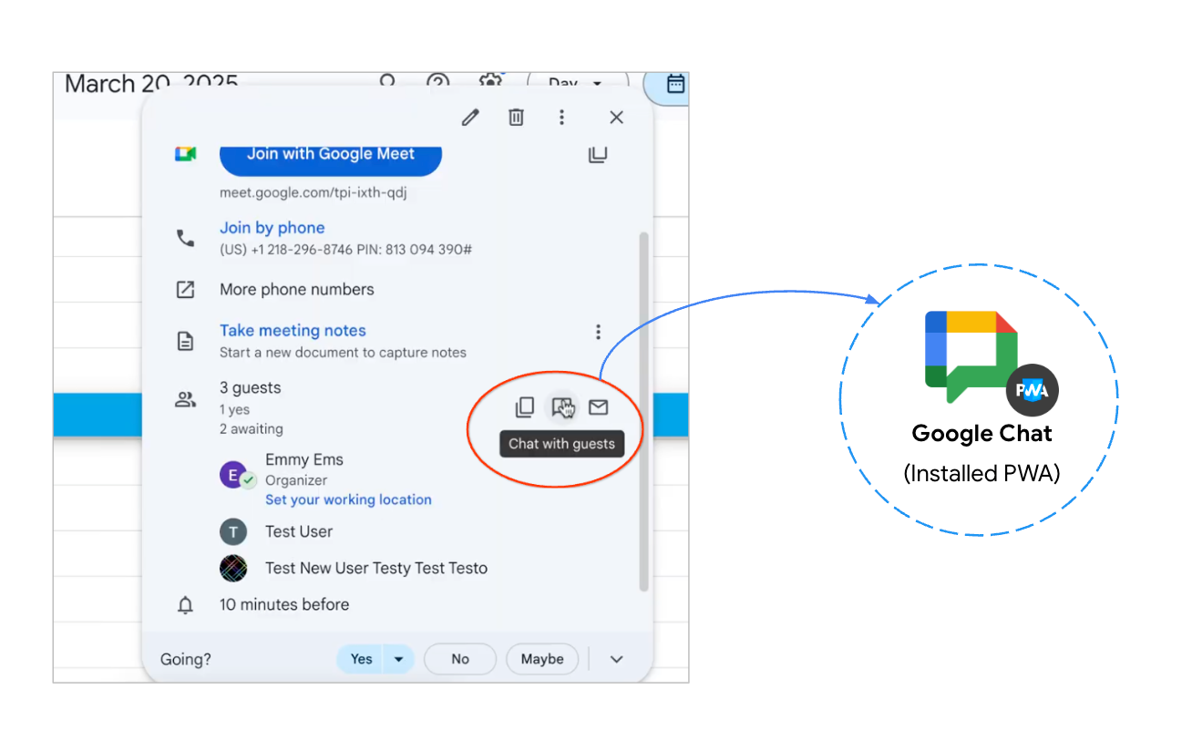 No vídeo a seguir, um usuário cria uma reunião do Google Agenda e convida três convidados. O app Agenda gera automaticamente um link do Google Chat que inclui todos os participantes. Quando o usuário clica nesse link, a sala de chat é aberta em uma nova guia do navegador. Um ícone na barra de endereço indica que um PWA correspondente está instalado, mas exige que o usuário o inicie manualmente. Este era o comportamento antes da atualização de captura de navegação: