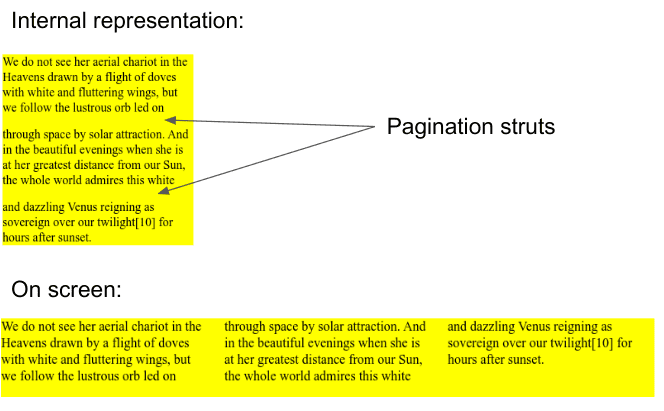 Saat menata konten yang dapat difragmentasi, mesin lama menata semuanya ke dalam strip tinggi yang lebarnya adalah ukuran inline kolom atau halaman, dan tingginya setinggi yang diperlukan untuk memuat kontennya. Strip tinggi ini tidak dirender ke halaman—anggaplah sebagai rendering ke halaman virtual yang kemudian disusun ulang untuk tampilan akhir. Secara konsep, hal ini mirip dengan mencetak seluruh artikel koran kertas ke dalam satu kolom, lalu menggunakan gunting untuk memotongnya menjadi beberapa bagian sebagai langkah kedua. (Dulu, beberapa surat kabar benar-benar menggunakan teknik yang mirip dengan ini!)