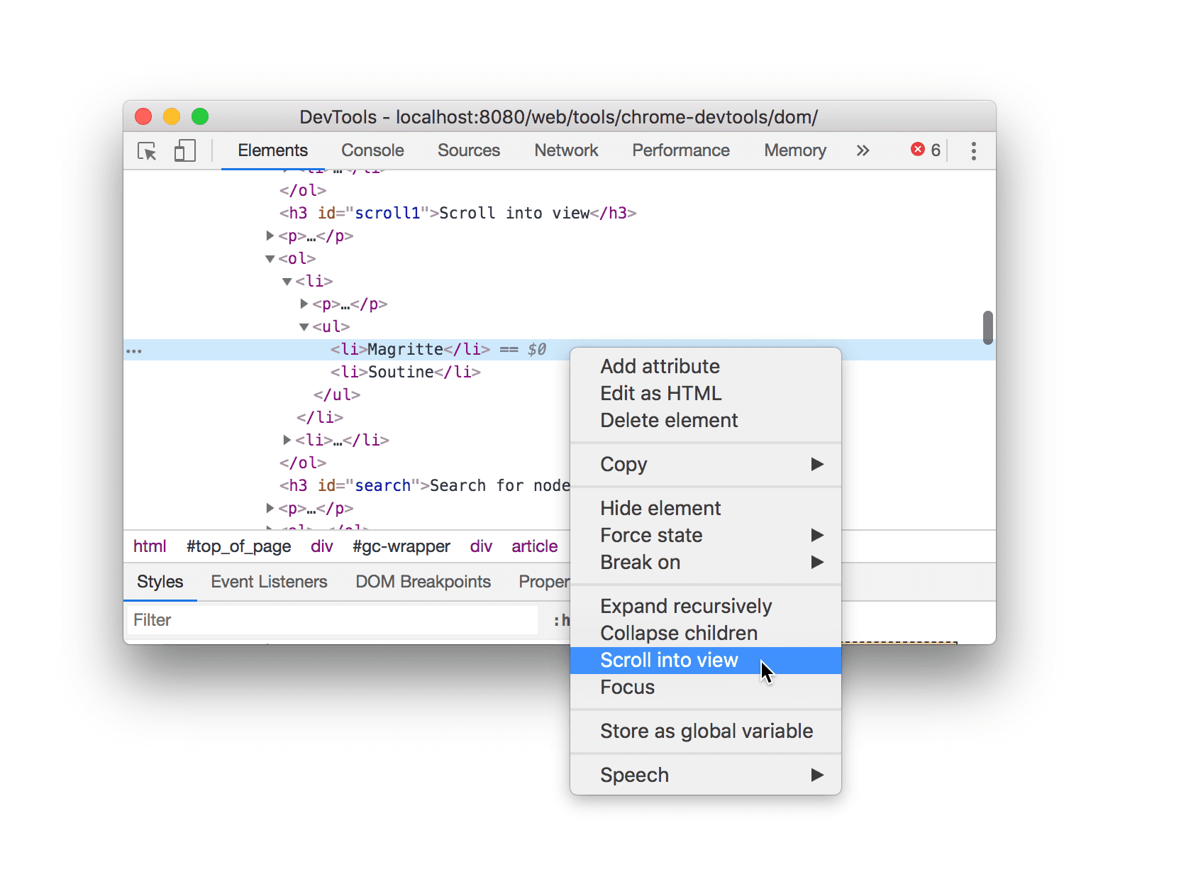 <li>Magritte</li>노드가 DOM 트리에서 선택된 상태여야 합니다. 아니면 보기로 스크롤로 돌아가 다시 시작합니다.<li>Magritte</li>노드를 마우스 오른쪽 버튼으로 클릭하고 보기로 스크롤을 선택합니다. Magritte 노드를 볼 수 있도록 뷰포트가 다시 위로 스크롤됩니다. 보기로 스크롤이 누락된 경우 누락된 옵션을 참고하세요.
