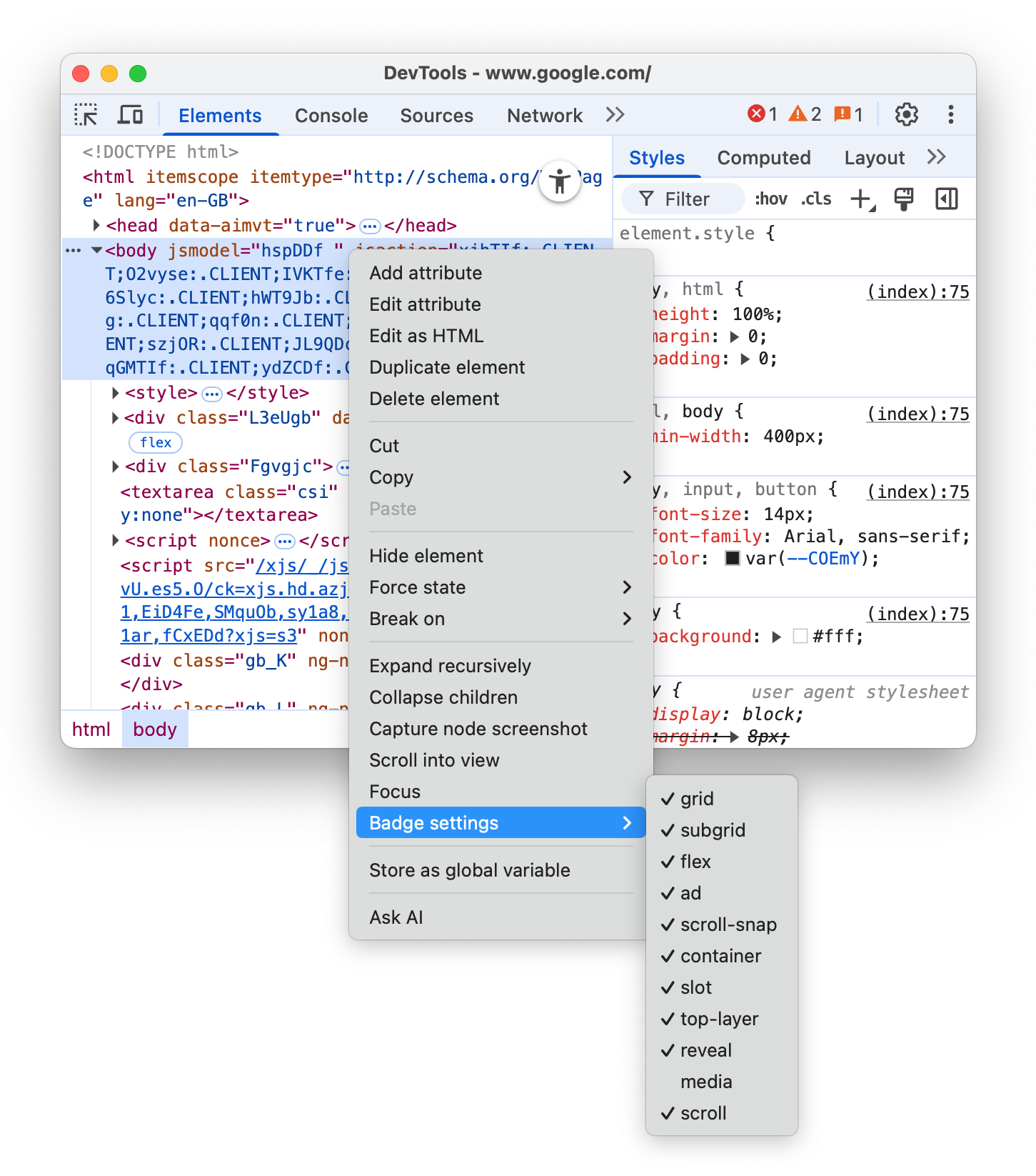 2. Haz clic con el botón derecho en un elemento del árbol del DOM y marca una o varias insignias en el submenú Configuración de insignias.
