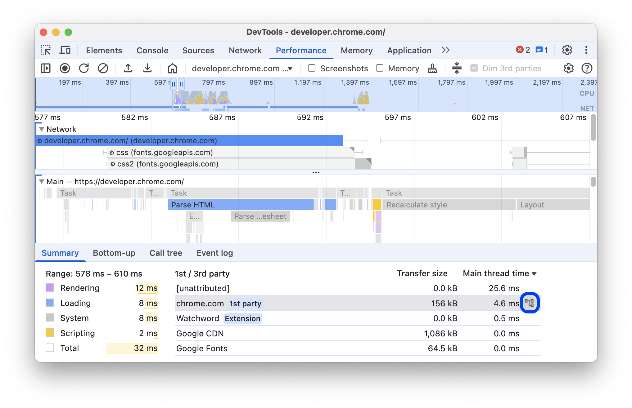Setelah Anda merekam performa runtime atau merekam performa pemuatan, panel Performa menyediakan banyak data untuk menganalisis performa dari apa yang baru saja terjadi.
