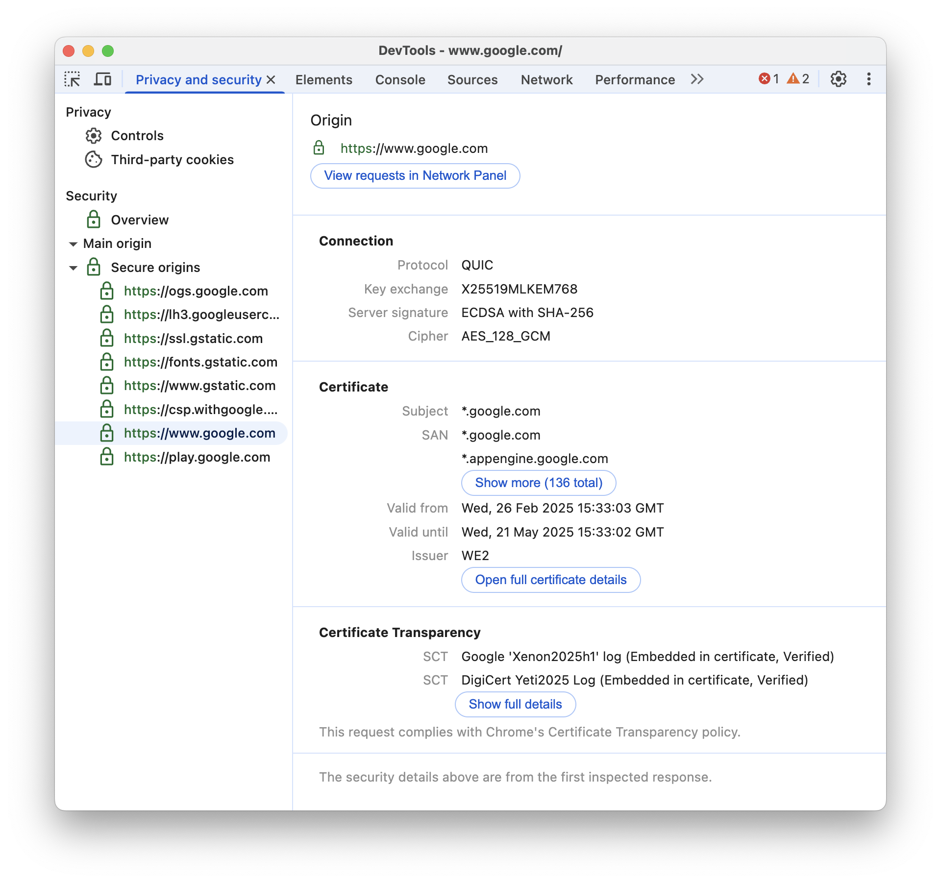 Kaynakla ilgili ayrıntıları görüntülemek için Güvenlik bölümündeki girişlerden birini tıklayın. Ayrıntılar sayfasında bağlantı ve sertifika bilgilerini görüntüleyebilirsiniz. Mevcut olduğunda sertifika şeffaflığı bilgileri de gösterilir.