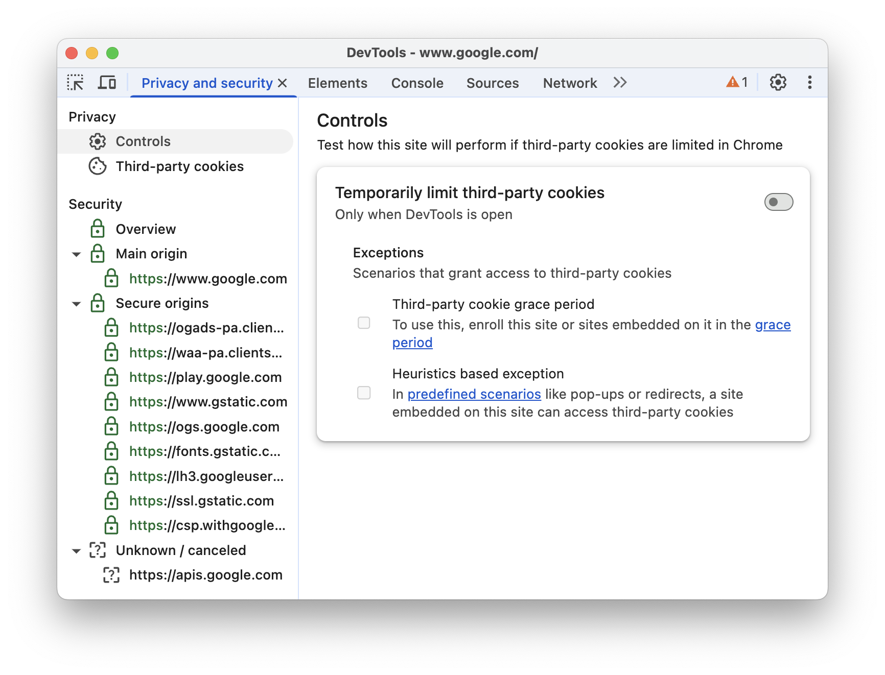 Üçüncü taraf çerezlerini incelemek ve kontrol etmek ve HTTPS korumasını kontrol etmek için Chrome Geliştirici Araçları'ndaki Gizlilik ve güvenlik panelini kullanın.