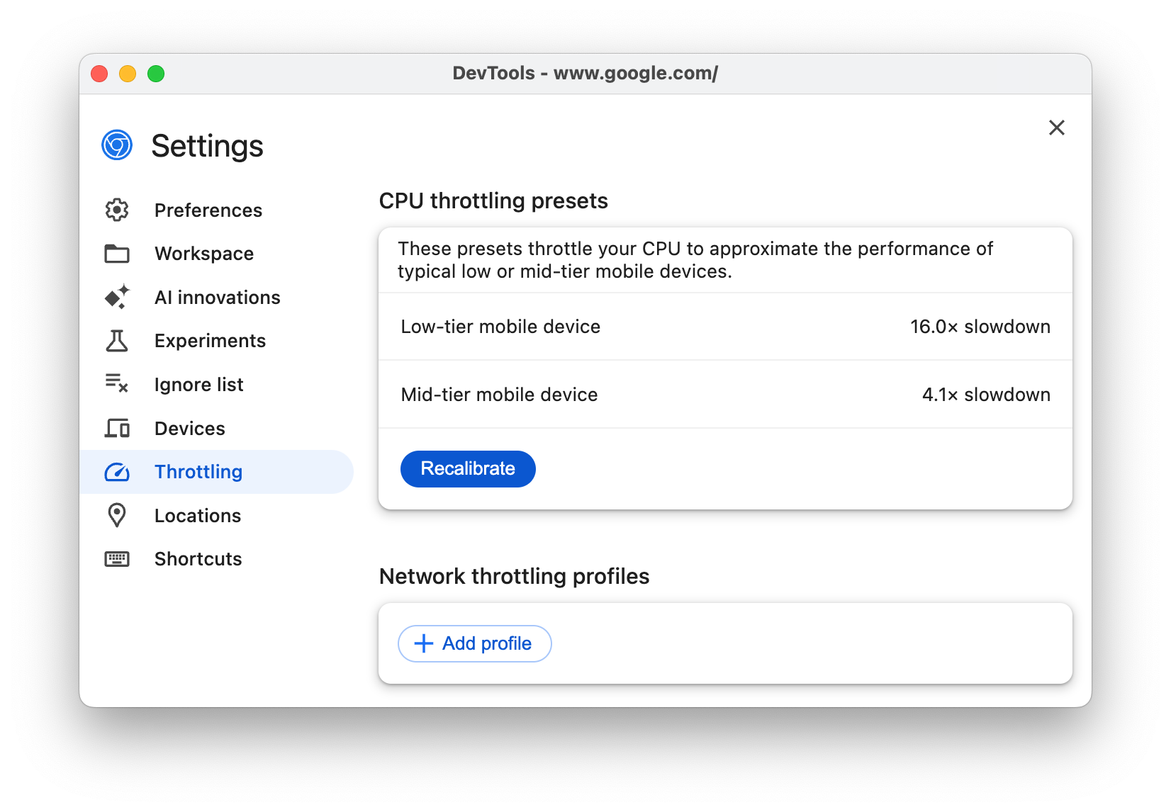 Thẻ Điều tiết sẽ cho thấy tốc độ điều tiết CPU mà bạn có thể áp dụng cho thiết bị của mình để biết hiệu suất của trang trên các thiết bị di động cấp thấp và trung bình.