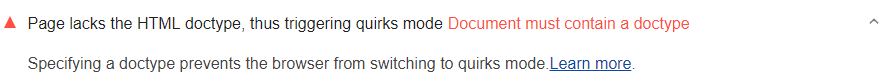 Halaman tidak memiliki doctype HTML sehingga memicu quirks mode