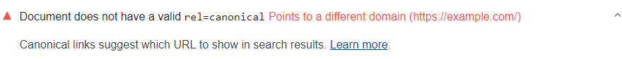 - Link kanoniczny wskazuje katalog główny witryny. Pamiętaj, że ten scenariusz może być sprawdzić się w niektórych sytuacjach, np. w przypadku wersji AMP lub stron mobilnych, ale Lighthouse jednak traktuje to jako awarię.