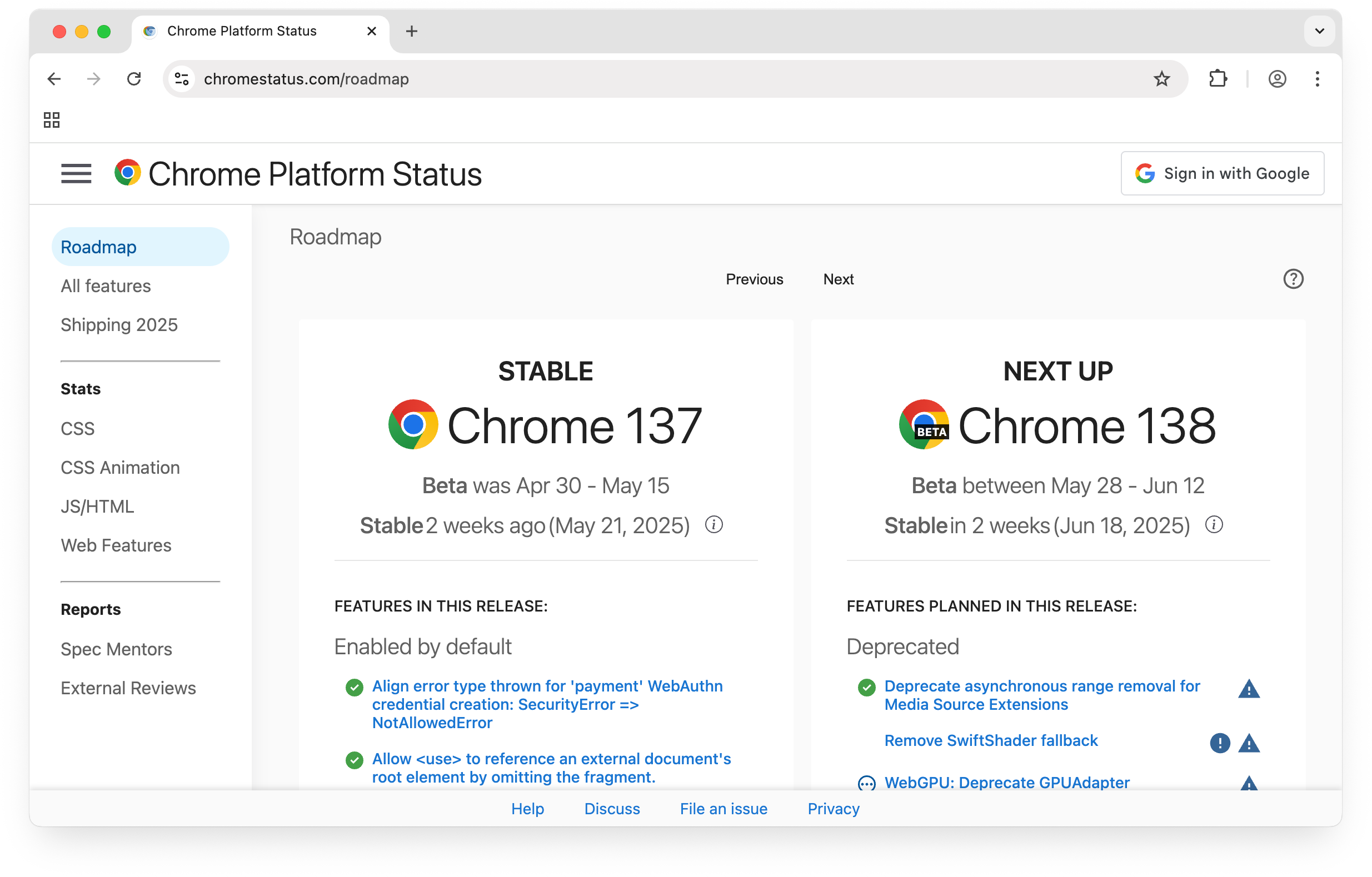 您可以在 Chrome 状态页面上跟踪功能的进度,还可以订阅更新、报告 bug 和查找其他资源。