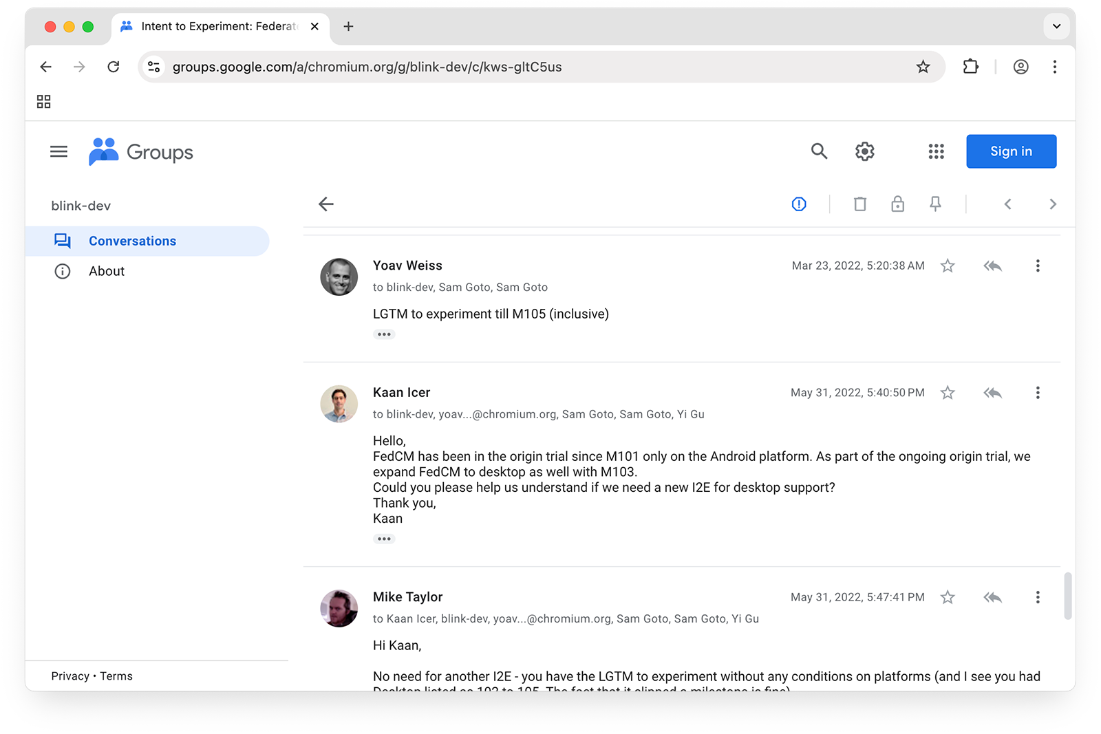 Für jeden Meilenstein, wenn Entwickler an einer neuen Funktion oder einer Änderung der Blink-Rendering-Engine arbeiten, veröffentlichen sie einen Beitrag in der Diskussionsgruppe blink-dev, in dem sie erklären, dass sie zur nächsten Phase der Implementierung einer Funktion übergehen möchten. Diese Beiträge werden als „Intents“ bezeichnet. Jeder kann die blink-dev-Gruppe abonnieren, um benachrichtigt zu werden, wenn es Fortschritte bei neuen Funktionen in Blink gibt, oder eine einzelne Funktion abonnieren, um Updates zu erhalten.