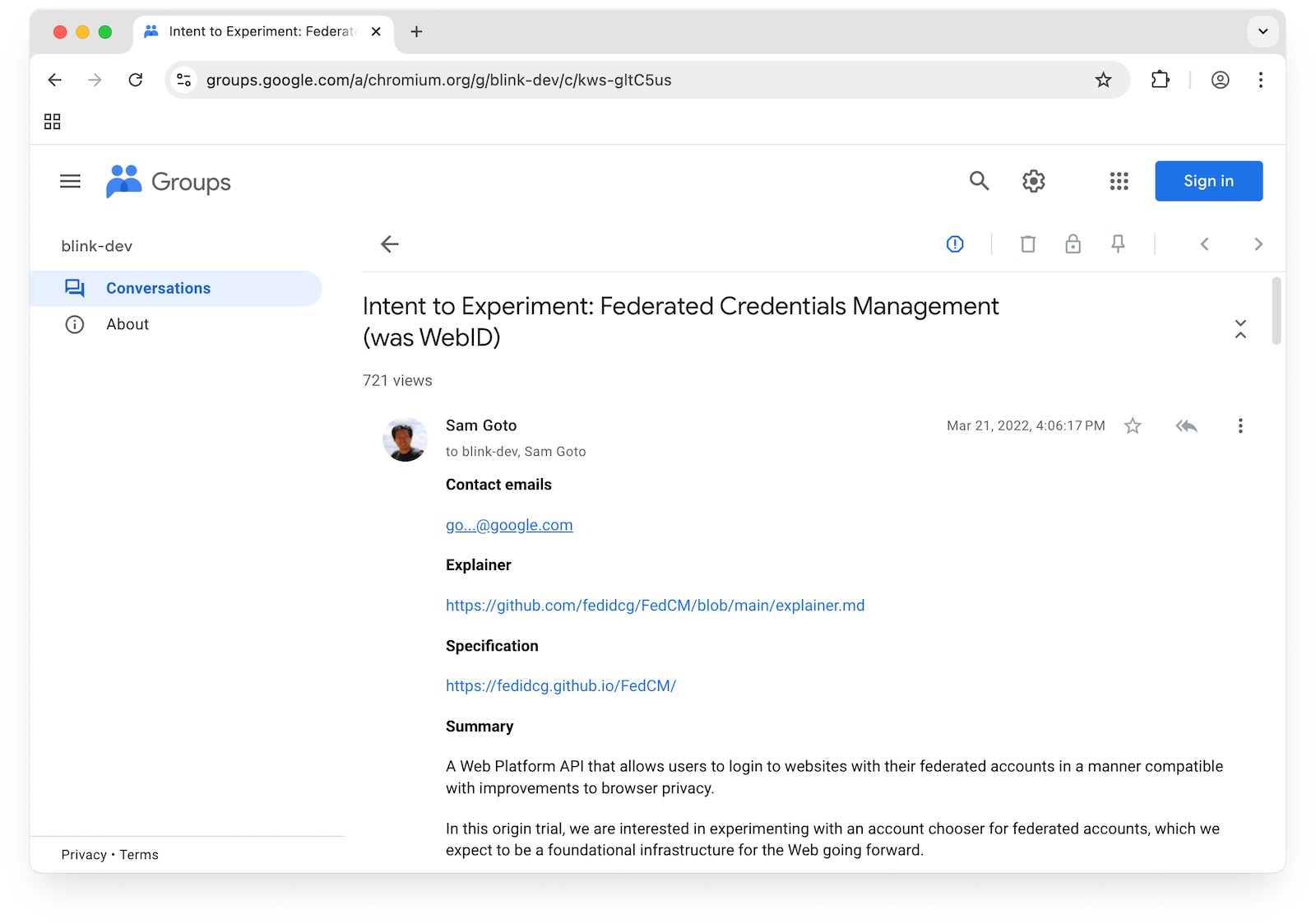 Bài đăng về Ý định thử nghiệm trên blink-dev là bước tiếp theo không bắt buộc, nếu các kỹ sư Chrome muốn yêu cầu chạy bản dùng thử theo nguyên gốc.