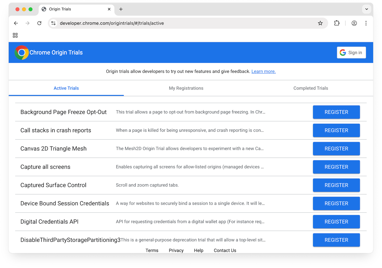 Bản dùng thử theo nguyên gốc là một cách để thử nghiệm một tính năng mới hoặc tính năng thử nghiệm trên nền tảng web. Bạn đăng ký bản dùng thử theo nguyên gốc của một tính năng, sau đó nhận được mã thông báo cho bản dùng thử đó. Tính năng này sẽ được kích hoạt trên mọi trang cung cấp mã thông báo.