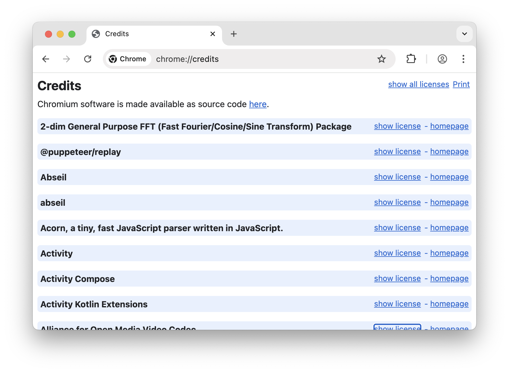 chrome://credits, se muestra una lista de tecnologías con vínculos al código de la función y a los sitios web.Consulta una representación gráfica de cómo se incluyen los recursos en Chromium con Visualizing entire Chromium include graph.